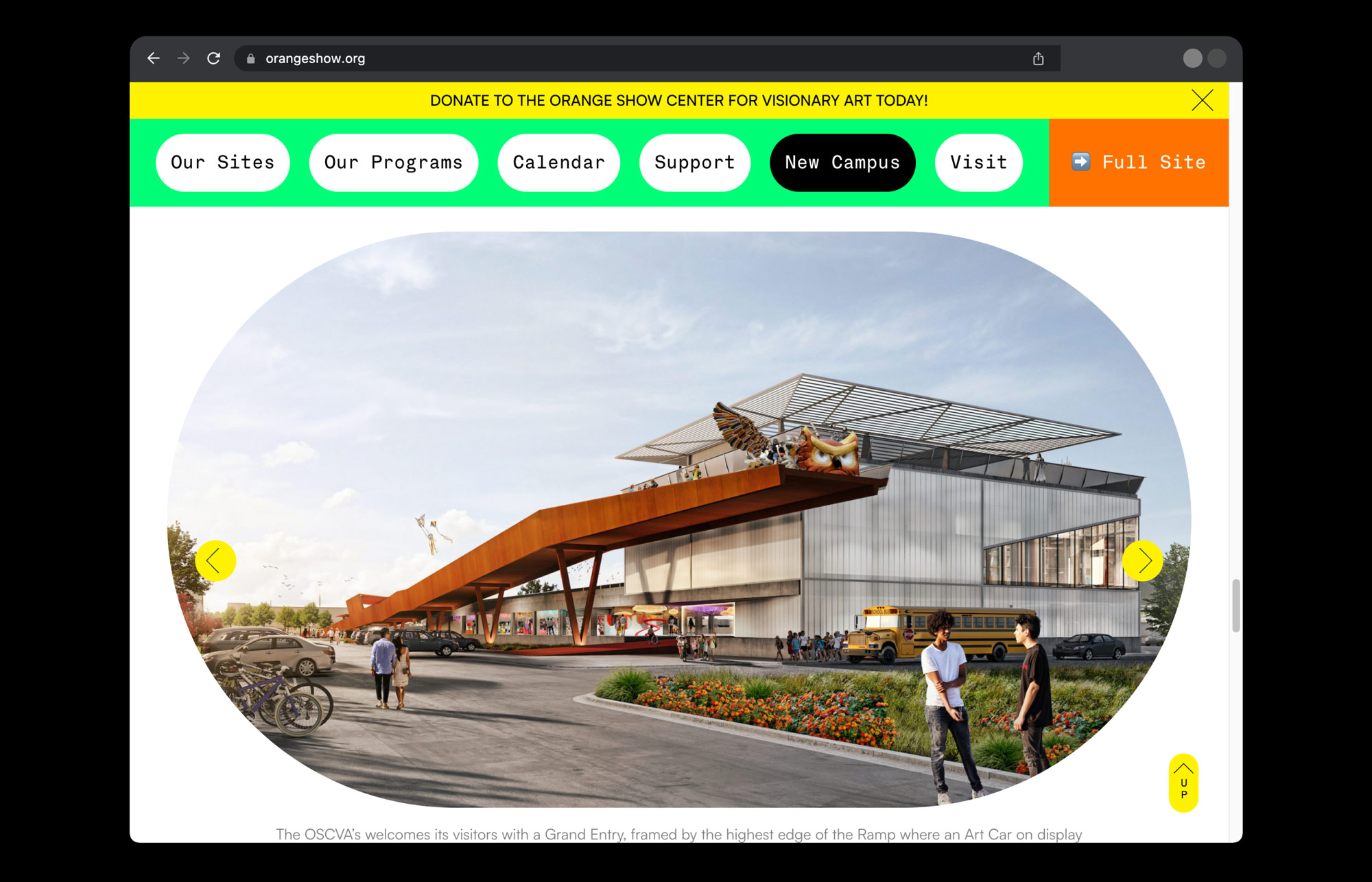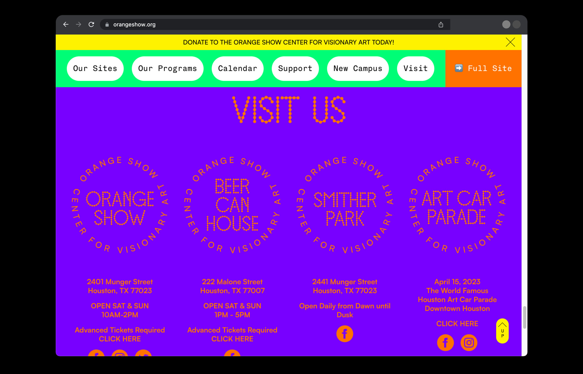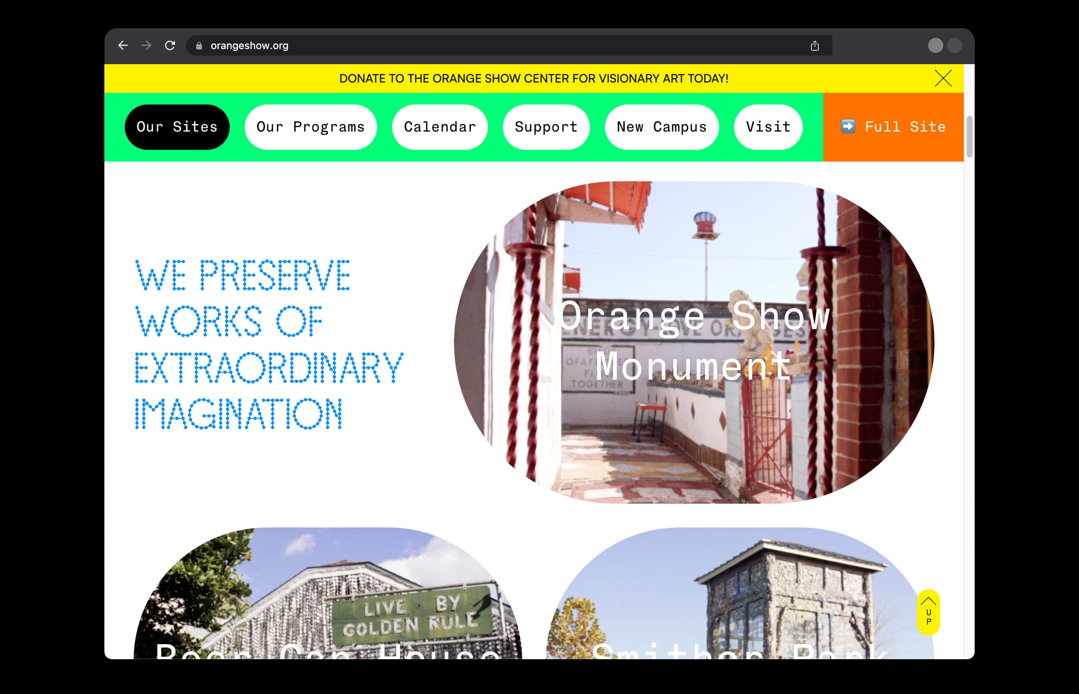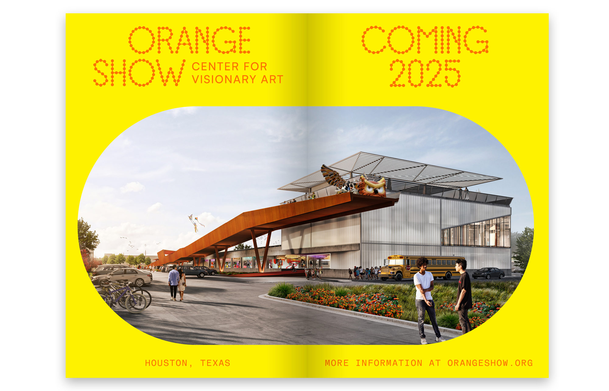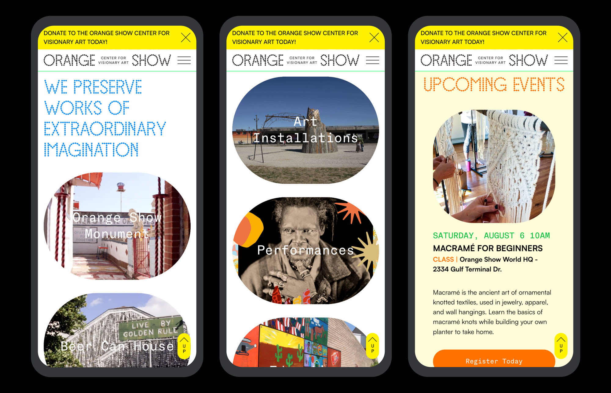 The Orange Show preserves, promotes, and documents visionary art environments, provides opportunities for the expression of personal artistic vision, and creates a community where that expression is valued. The new identity and interstitial website coincides with a major expansion plan that will focus on bringing the visionary art community together to make, teach, and view performing and visual arts across a 5.7-acre campus. The interstitial serves as a reintroduction of the Orange Show to current and new audiences as it gears up to open it's new campus in 2026, which will be accompanied with a new (full) website redesign.