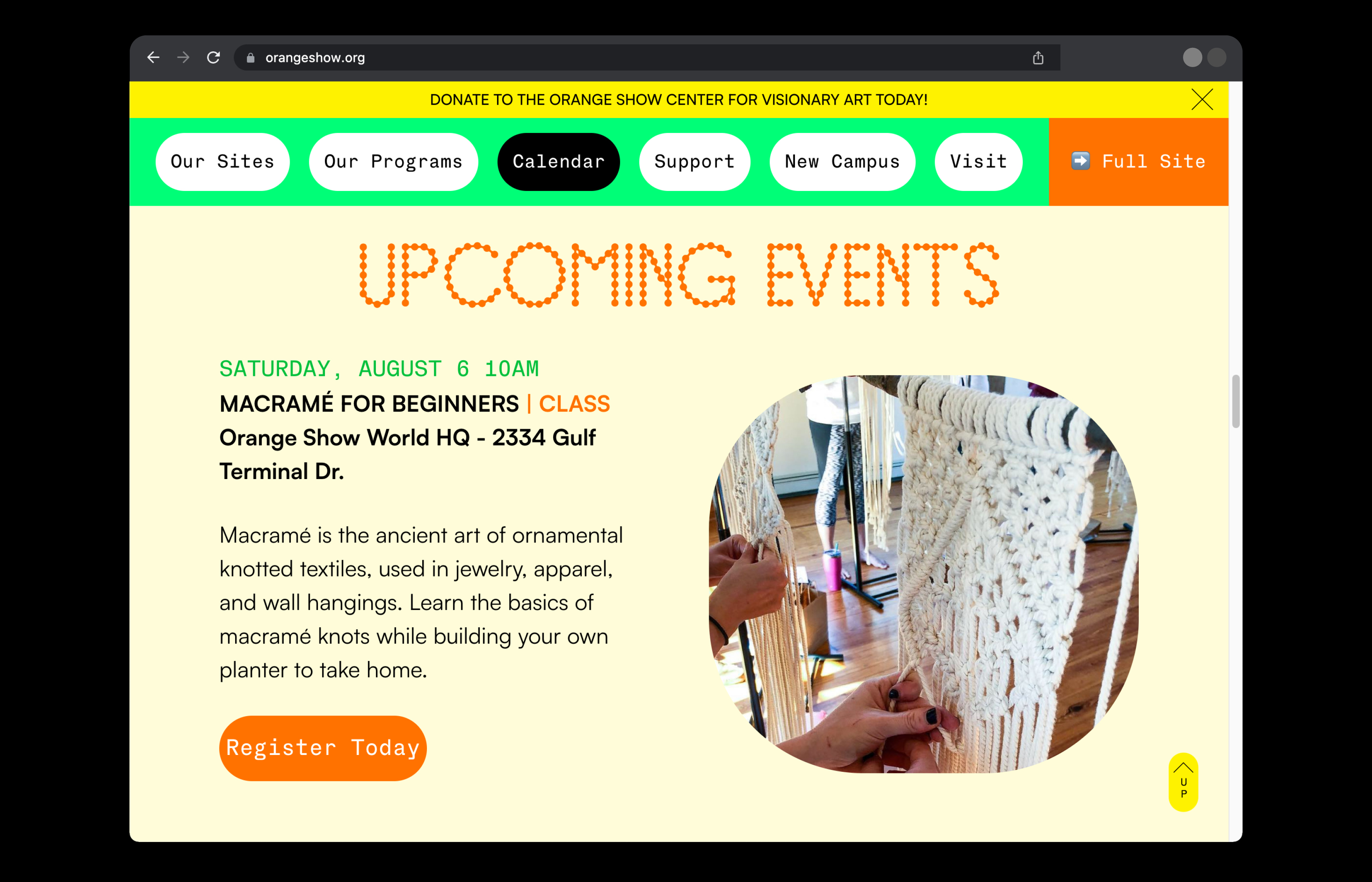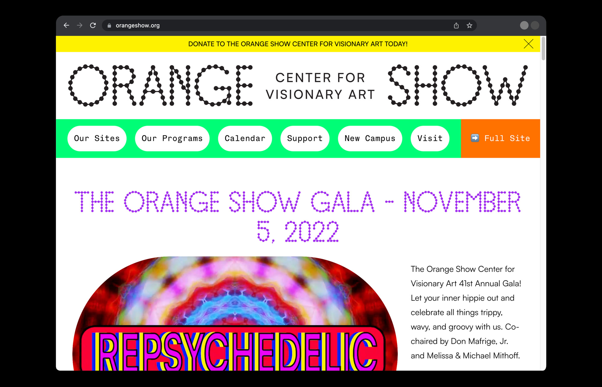 New visual identity and interstitial website design and development for The Orange Show Center for Visionary Art in Houston, Texas