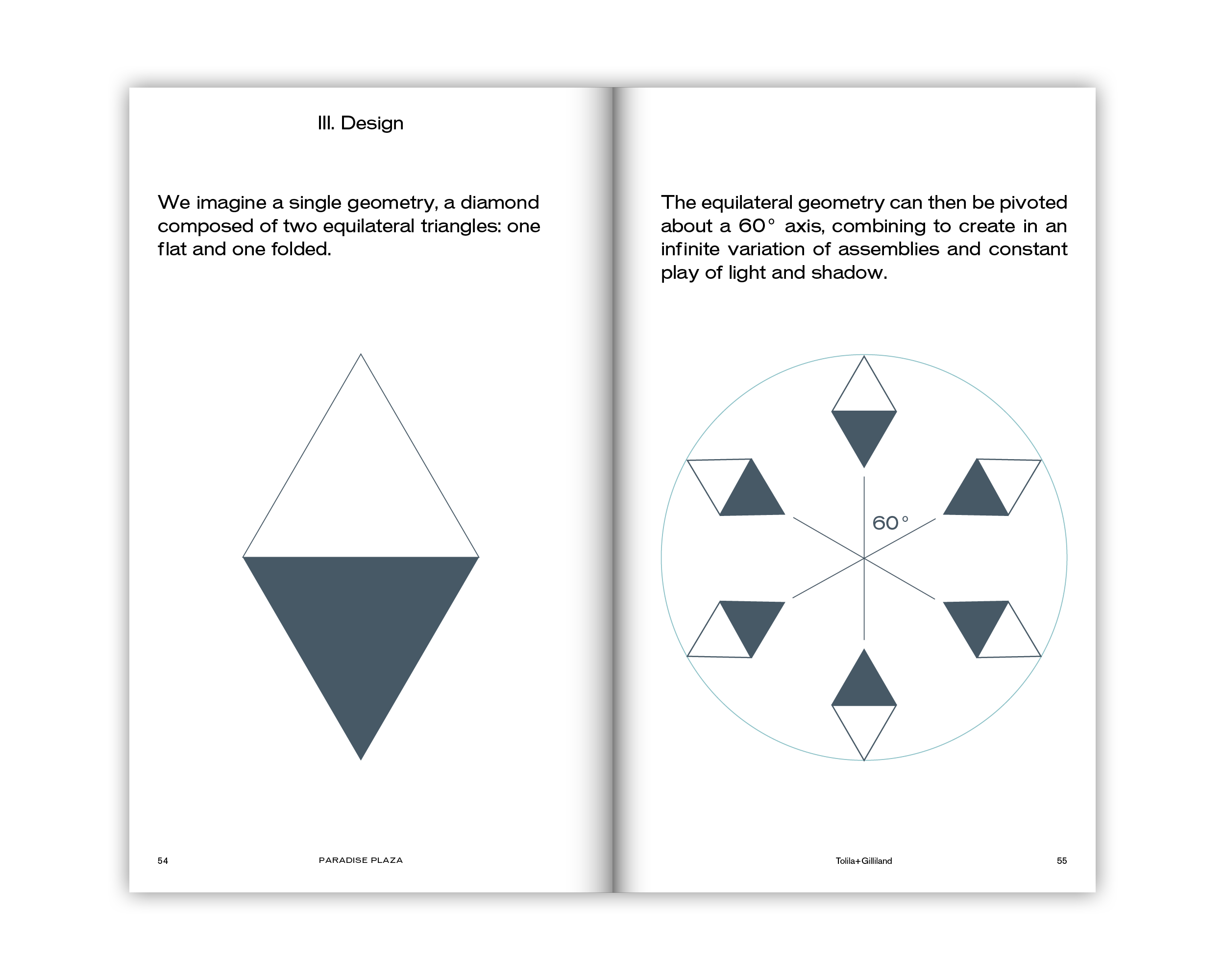 Tolila+Gilliland's design was centralized around a single geometry, a diamond composed of two equilateral triangles: one flat and one folded, then be pivoted about a 60° axis, combining to create in an infinite variation of assemblies and constant play of light and shadow.